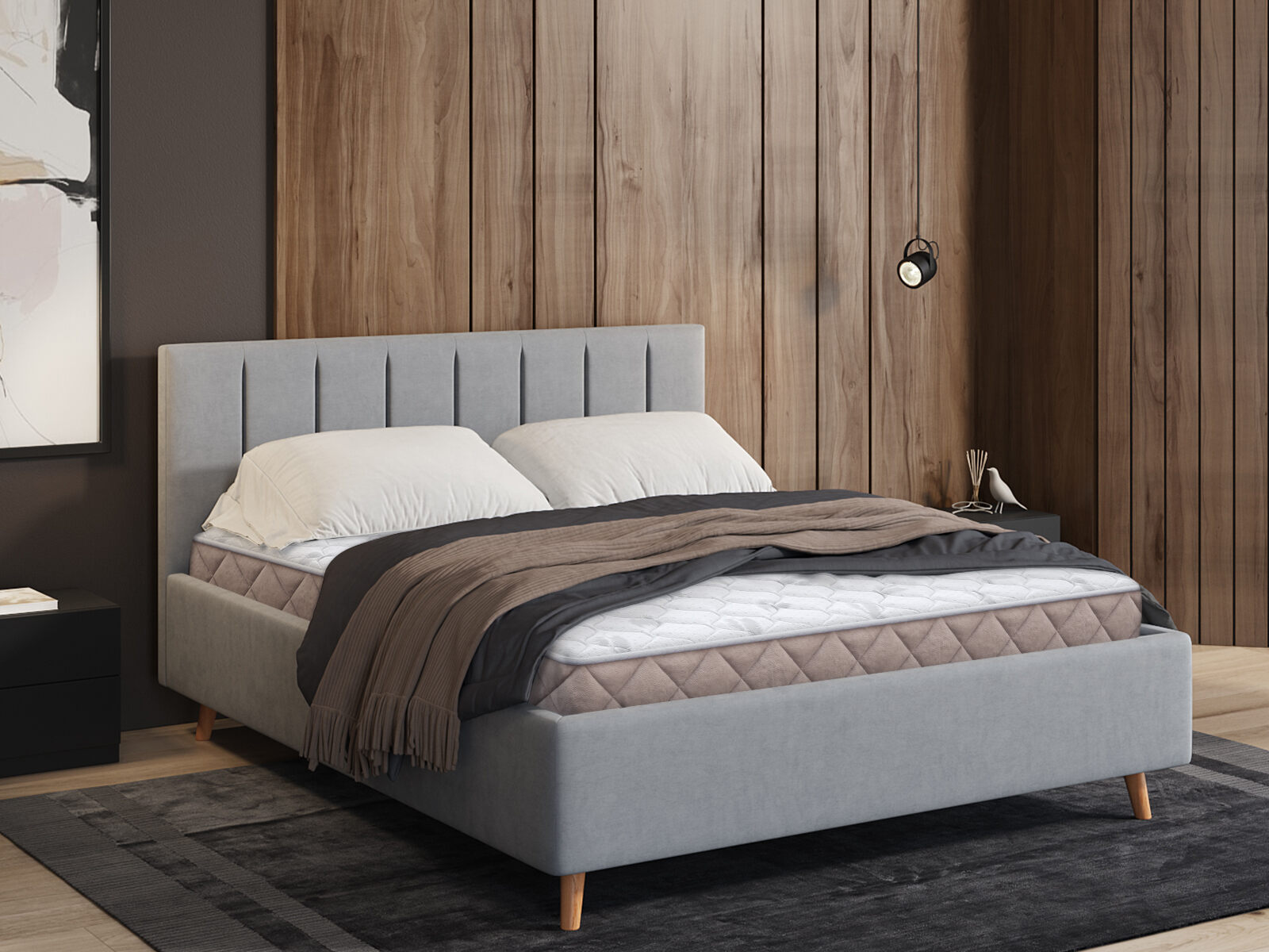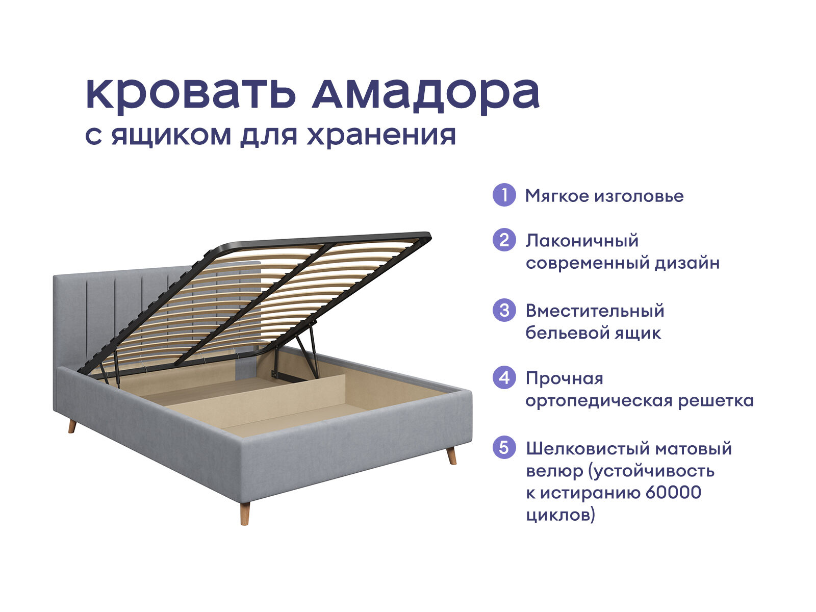 Кровать получила лёгкий и элегантный дизайн. Изголовье с мягкими вертикальными секциями украсит любую спальню и добавит уюта месту отдыха. Изящные наклонные ножки из дерева визуально облегчают конструкцию и обеспечивают просвет над полом, где легко пройдёт робот-пылесос. Корпус кровати выполнен из ДСП. Для обивки кровати используется велюр – мягкий и бархатный материал, который предпочитают ценители нежных прикосновений. В комплект входит ортопедическое металлическое разборное основание с подъемным механизмом.