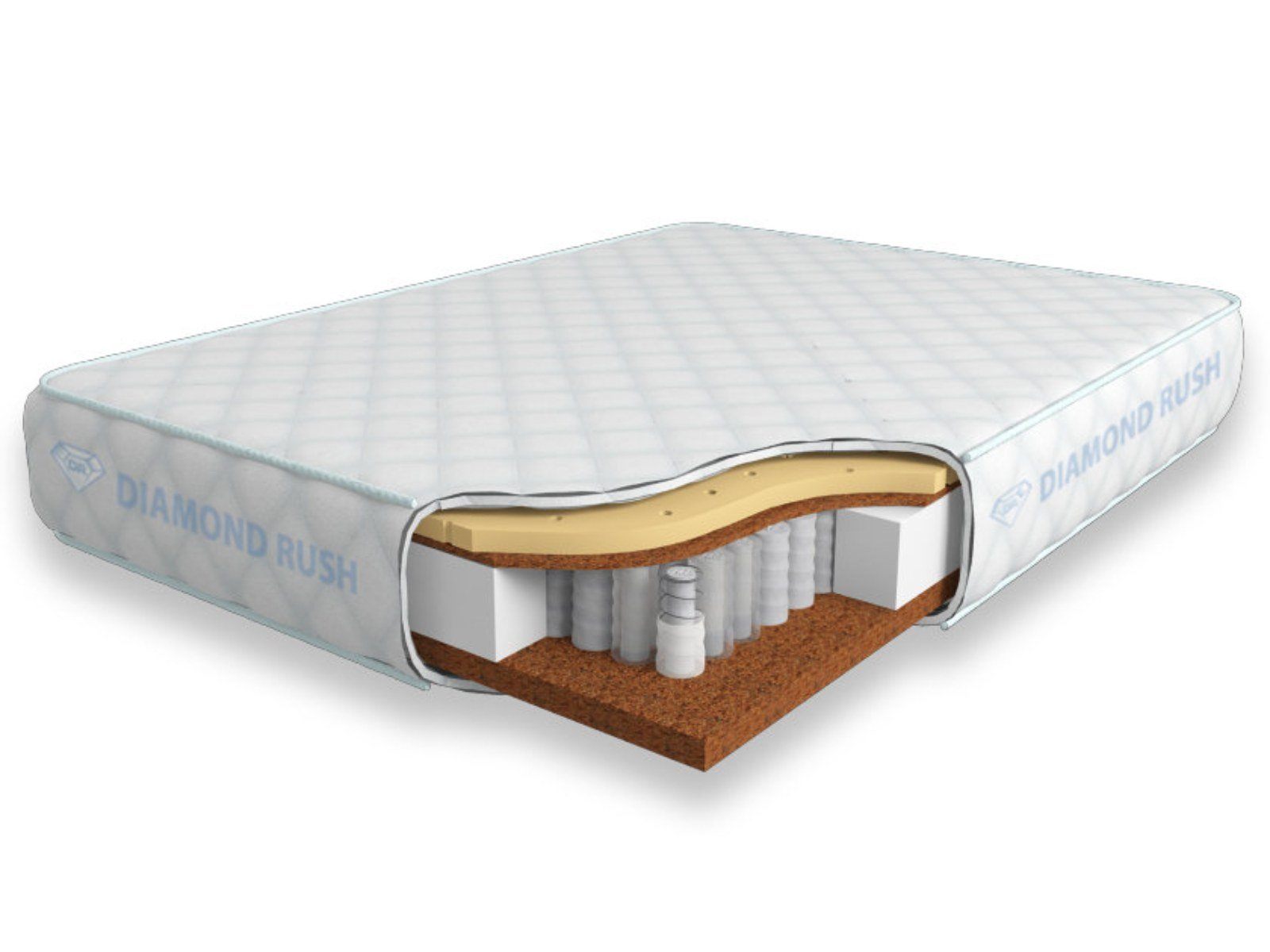 Матрас Diamond Rush Cocos Ergo DP LD имеет в своей основе независимый пружинный блок DP, состоящий из сдвоенных пружин диаметром 3-4 и 5-6 см. В качестве настилочных слоев поверх пружинного блока используются листы латексированной кокосовой койры и перфорированного натурального латекса. Матрас является жестким с одной стороны и среднежестким с другой. Вся эта конструкция одета в качественный чехол из трикотажа. Эта ткань безопасна для кожи, не боится стирки и химчистки.