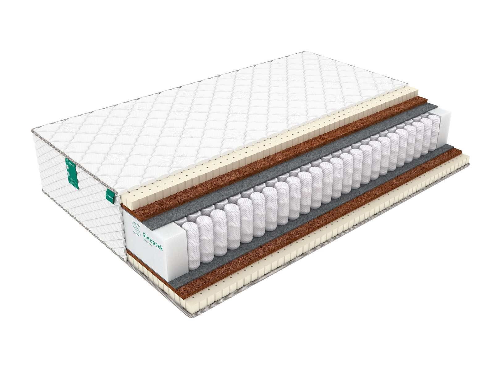 По обеим сторонам пружинного блока предусмотрены прослойки термовойлока, которые защищают наполнитель от повреждения пружинами. Поверх слоев войлока находятся плиты наполнителей – натурального латекса и койры кокоса. Жесткая койра придает матрасу ортопедические качества, а латекс смягчает спальную поверхность и обеспечивает комфорт.
