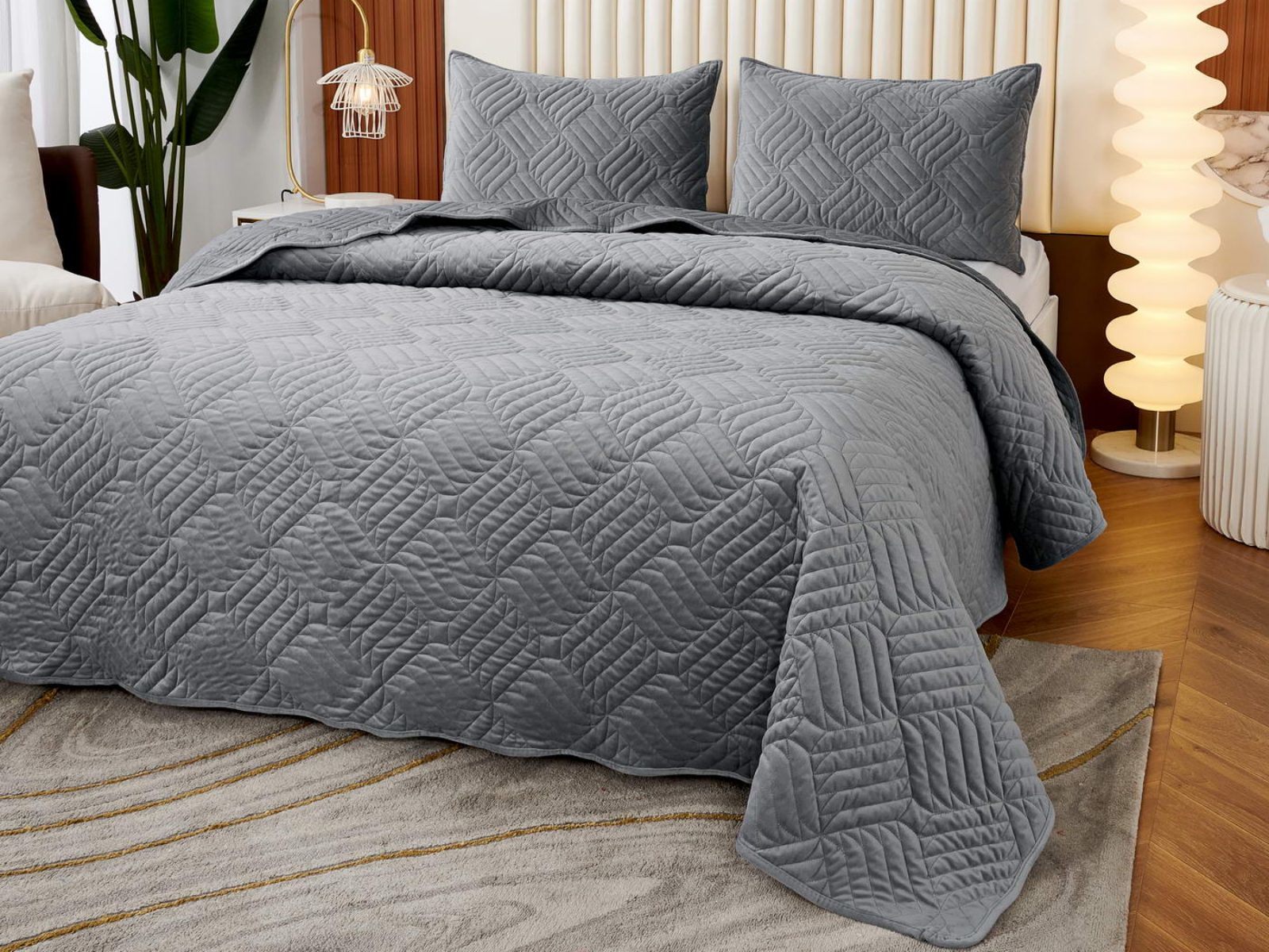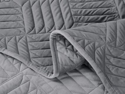 Покрывала выполнены в 10 оттенках: крем, мокко, пепельный, песочный, светло-бежевый, светло-серый, серый, темно-серый, чайная роза и черный. Стежка в виде геометрического орнамента подойдет к любому современному интерьеру. Из-за особого плетения, велюровая ткань покрывала отражает свет и красиво переливается при различном освещении.