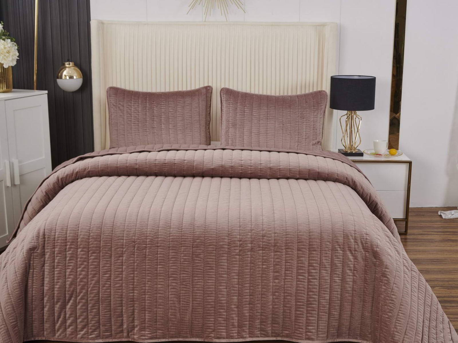 Величественный вид, мягкость материала, королевская роскошь – всё это идеально описывает новое покрывало Фердинанд. Оно выполнено из велюра на основе полиэстера и представлено в оттенках: чайная роза, молоко, бежевый, кофе, стоун, серый и мокко.